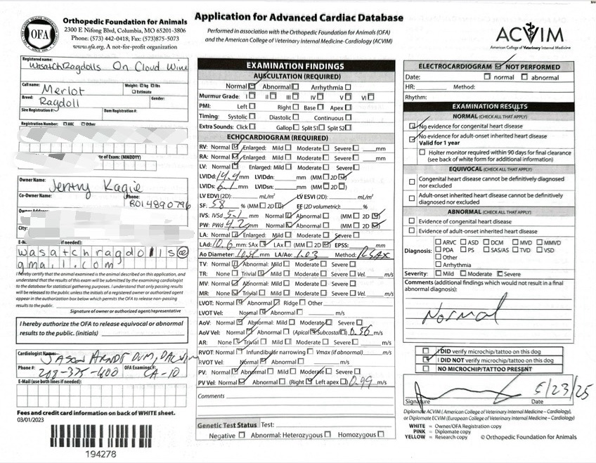 2025 HCM ECHO Heart Scan Clear, performed by OFA and ACVIM cardiologist Jason Arndt, DVM DACVIM